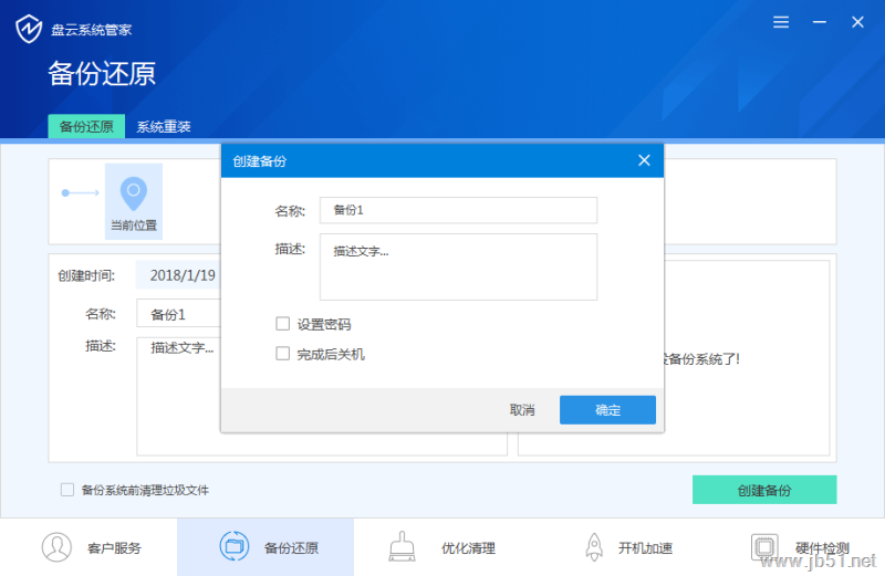 備份還原:點擊創建備份并選擇需要備份的盤,開始備份即可。