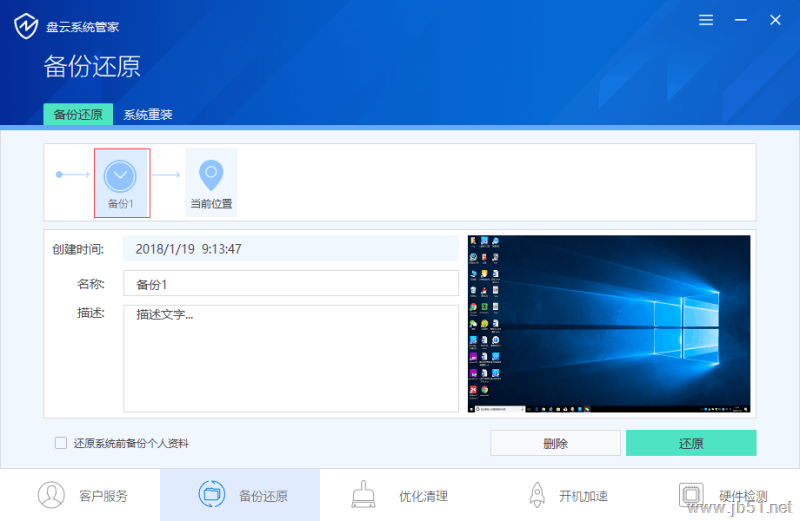 如果想要還原歷史備份直接點還原即可。如果感覺當前備份已經包含了“備份1”則可以選擇刪除“備份1”
