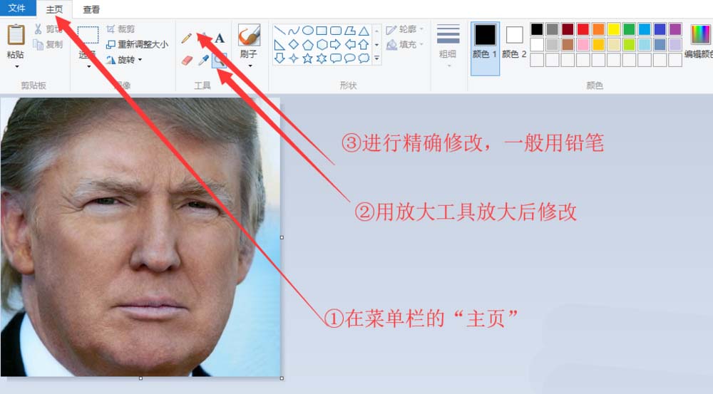 2、在畫圖工具的菜單里,找到“主頁”,一般打開畫圖,就是這個界面。認識一下放大鏡和鉛筆工具,精確修改離不開這兩個工具。