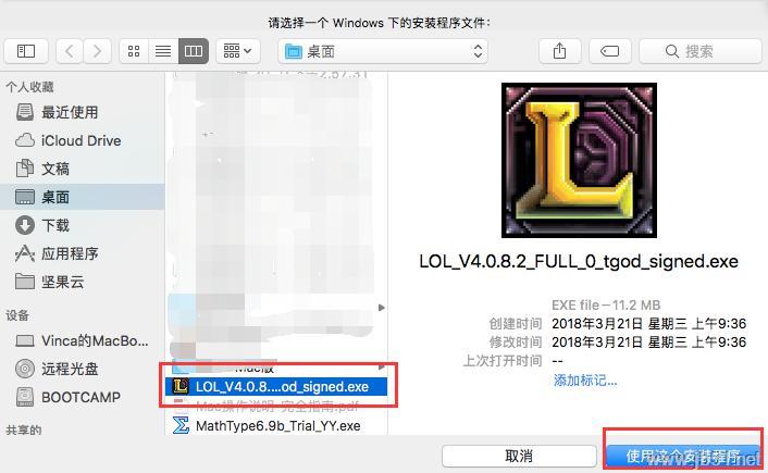 3、在選擇一個(gè)安裝包來(lái)源中選擇“選擇安裝文件”,在出現(xiàn)的小窗口中選中之前下載好的英雄聯(lián)盟安裝包,然后點(diǎn)擊“使用這個(gè)安裝程序”;