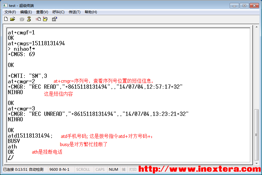 發短信,輸入AT+CMGS=15118131494按回車(15118131494 為手機號) 按提示在〉后輸入內容后按Ctrl+Z發信息