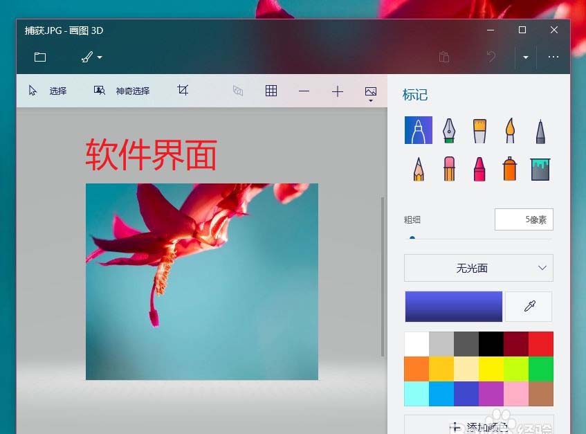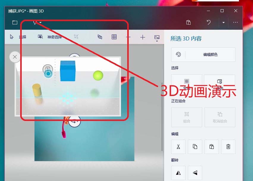 4、等待畫圖3D工具啟動后,進入畫圖3D界面,截取的圖片展現(xiàn)在3D畫圖工具中。
