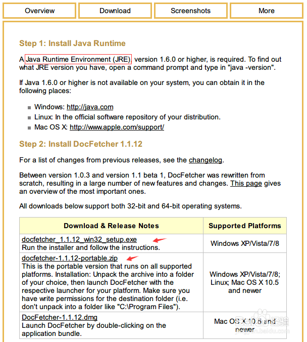 2、由于該軟件是基于Java的,所以首先必須下載安裝JRE。然后下載DocFetcher,請(qǐng)選擇安裝版或便攜版進(jìn)行下載,這里我就下載便攜版;