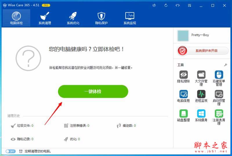 1、在武林網下載Wise Care 365軟件,小編使用的是Wise Care 365單文件版,在首頁我們就可以看到一鍵體檢。