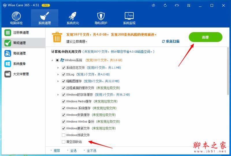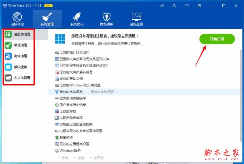 2、在Wise Care 365軟件的系統(tǒng)清理中有注冊表清理、常規(guī)清理、高級清理、系統(tǒng)瘦身、大文件管理等功能,選中以后點擊開始掃描。