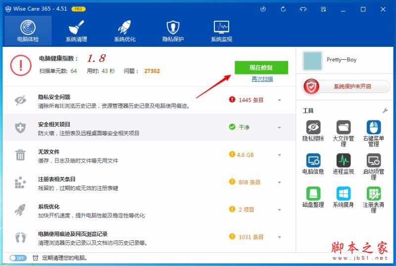1、小編的電腦已經很長時間沒有清理,Wise Care 365系統(tǒng)清理軟件體檢時間只用了443秒,還是非常的出色的,掃描完成以后點擊現在修復就可以了。