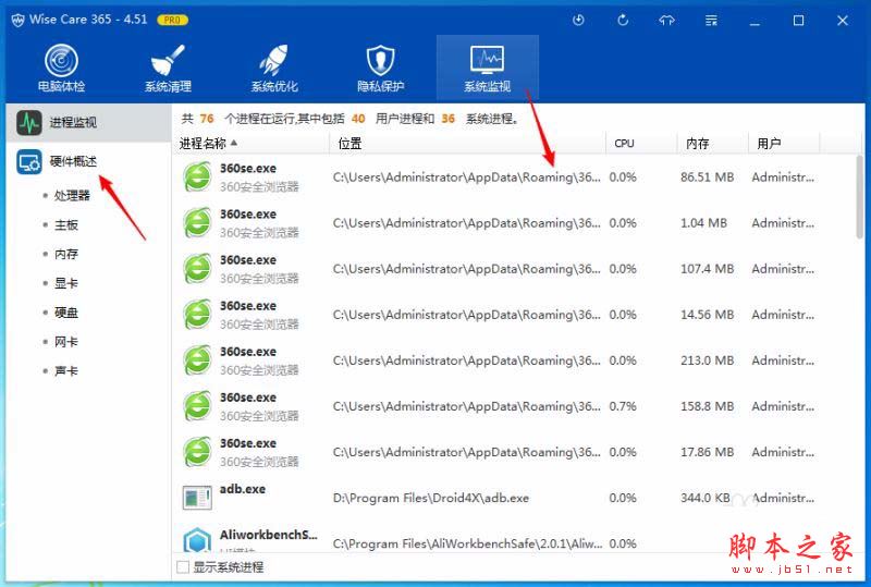 7、最后我們在Wise Care 365軟件的系統(tǒng)監(jiān)視中可以看到正在運行的進程,在左側還可以選擇查看電腦的硬件信息,總體來說軟件掃描速度快,功能齊全,Wise Care 365軟件怎么用已經告訴大家了哦~