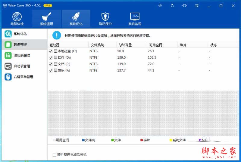 4、在Wise Care 365 pro軟件的系統(tǒng)優(yōu)化中還有磁盤整理、注冊表整理、啟動項管理以及右鍵菜單管理等,通過這些可以進一步提高系統(tǒng)的性能。