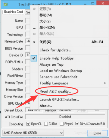 3、還有一個(gè)大家比較關(guān)心的就是查看顯卡體質(zhì),只需要在GPU-Z這個(gè)工具的標(biāo)題欄中點(diǎn)擊右鍵,然后再點(diǎn)擊【Read ASIC quality】這一項(xiàng)就可以看得到顯卡體質(zhì)。