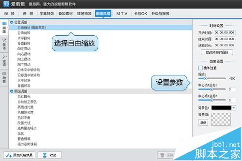 如果不想視頻有黑邊,又想完全去除字幕的痕跡,我們還可以放大視頻畫面,將字幕去除。我們只需點(diǎn)擊“畫面風(fēng)格”面板的“畫面”選項(xiàng)卡,選擇“自由縮放”,然后在風(fēng)格列表右側(cè)設(shè)置參數(shù),調(diào)整畫面。