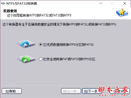 在彈出新界面中,選擇要進行轉換的方式。老司機的需求是從FAT32轉換到NTFS,勾選第二項即可。第一項的作用大多是需要磁盤放到Linux系統中使用。