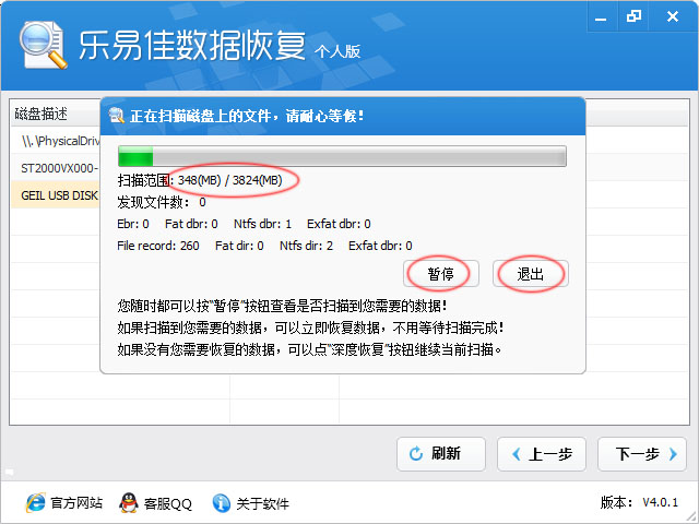 恢復磁盤的文件功能掃描整個磁盤的空間,如下圖,我們掃描的是一個4G的U盤。