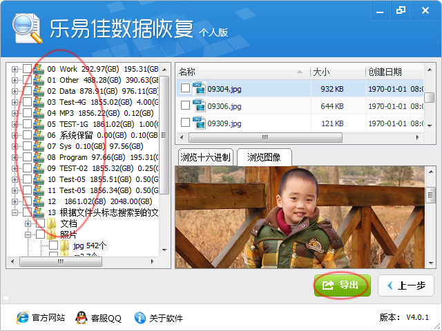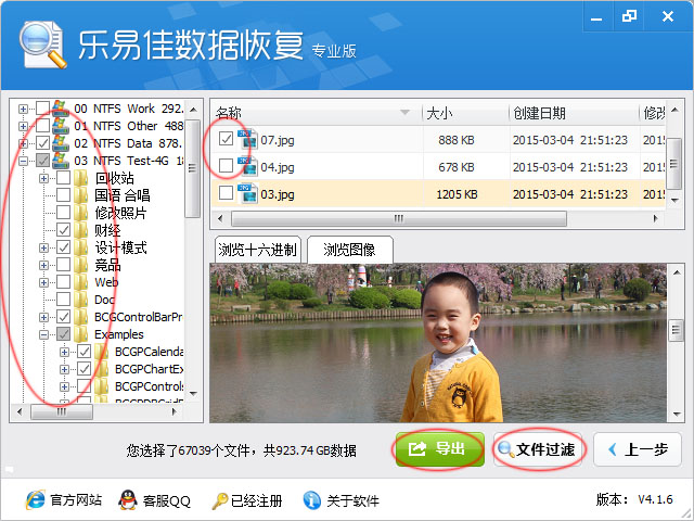 6、如果找到您要恢復的文件,可以在樹形控件和列表控件里勾選您需要恢復的文件和目錄。然后點擊“導出”按鈕,導出數(shù)據(jù)。
