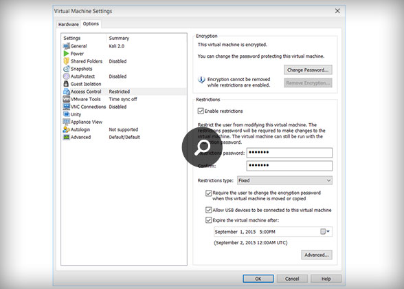 創建和控制與您的虛擬機有關的策略,并在 Workstation 12 受限虛擬機容器內為終端用戶提供應用。通過限制對 Workstation 虛擬機設置的訪問(例如拖放、復制和粘貼以及連接 USB 設備)來保護公司內容。此外,還可以對虛擬機進行加密和密碼保護,以確保未經授權的用戶無法篡改企業虛擬機設置。