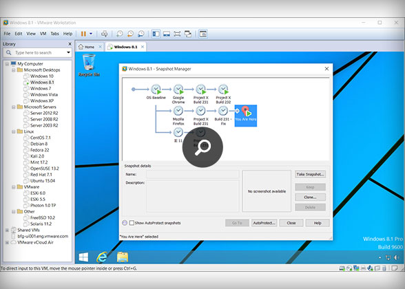 借助 Workstation 12 Pro,您可以使用快照和克隆功能保護您的虛擬機并節省寶貴的時間。快照功能可保留虛擬機的某個狀態,因此您可隨時返回此狀態。使用克隆功能可以輕松復制 Workstation 虛擬機,并可以直接在基準安裝和配置的基礎上創建無數個虛擬機副本。鏈接克隆是一種復制復雜設置的更快、更簡單、更高效的方式,適用于測試和自定義演示。鏈接克隆將會制作一個與父虛擬機共享虛擬磁盤的虛擬機副本,這樣做的好處是所占磁盤空間比完整克隆少得多。