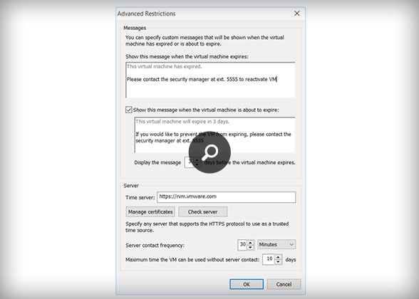 對于分配至短期項目的員工、臨時員工或僅僅是交付軟件評估的情況,Workstation 允許您創建可在預定義的日期和時間過期的受限虛擬機。啟動后,虛擬機將以指定的時間間隔查詢服務器,從而將受限虛擬機的策略文件中的當前系統時間存儲為最后受信任的時間戳。過期的虛擬機將自動掛起,并且在沒有管理員干預的情況下不會重新啟動。