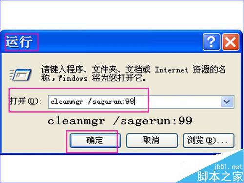 5、下面來介紹下另外一個參數 /sagerun:n 。簡單明了的說,前一個參數是設置清理的任務,而這個參數則是開始執行已經設置好的任務,n值推薦和上一個參數的n值保持一致。然后開始--運行輸入 cleanmgr /sagarun:99 ,確定