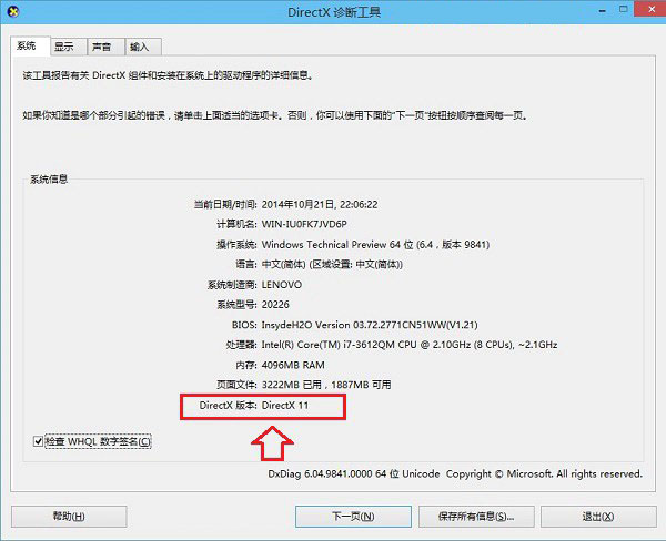 由于武林網小編目前使用的是Win10技術預覽版,從圖中可以看出,Directx版本和Win8.1一樣,依舊是DirectX 11版本,并不是DirectX 12,不過即將于2015年推出的Win10正式版將內置最新的Directx12版本,正式版期間,大家可以再使用這種方法查看Win10的Directx版本。