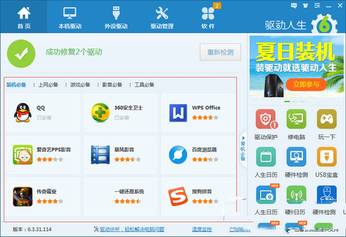讓新買的電腦能夠正常使用,最后一步便是安裝常用軟件了。點(diǎn)擊驅(qū)動(dòng)人生“裝機(jī)必備”按鈕,可以勾選你經(jīng)常使用的軟件,一鍵安裝。
