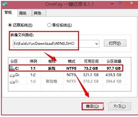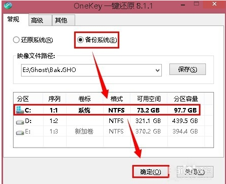 3、運行onekey 工具后就可能看到備份還原的單選,根據你的需要求選擇,選擇分區的時注意,一定要意得是C盤才可以操作的。點擊【確定】