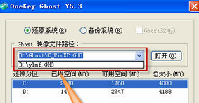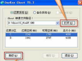 2、一般操作只需要選擇 打開 瀏覽到您的*.GHO文件,選擇要恢復的分區即可。如果有特殊要求可以點擊左下角的高級選項