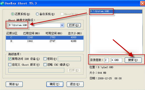 4、點擊搜索,可以找到您硬盤或光盤的*.GHO文件,雙擊導入路徑