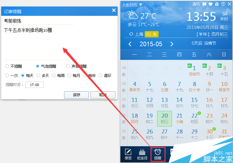其次,考生要合理安排好作息時間,早睡早起,加強運動,注意考前的心理準備。家長和考生每天用人生日歷的提醒功能,將作息時間和身體鍛煉安排提前提醒,將身體調整到最好的狀態,以便迎接高考。如下圖,打開人生日歷,點擊主界面的提醒功能,設置提醒內容、時間及方式等。