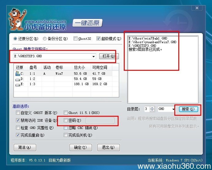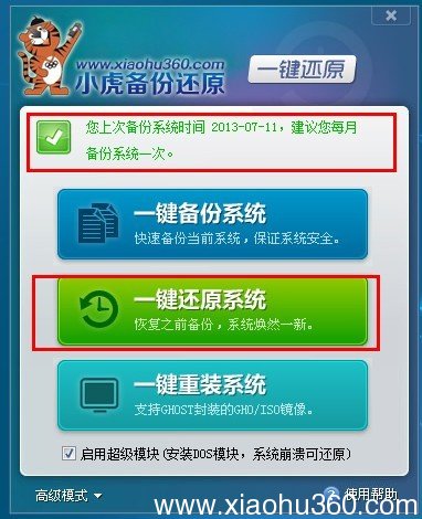 3、備份完畢后重新啟動電腦,打開小虎一鍵還原程序即可看到程序自動檢測到剛剛備份了系統(tǒng)。以后當系統(tǒng)中毒或是出現(xiàn)其它問題時點擊(請在還原之前提前備份好系統(tǒng)盤的個人資料,還原時將對C盤原有數(shù)據(jù)進行覆蓋。)即可將系統(tǒng)恢復到之前備份的狀態(tài)。