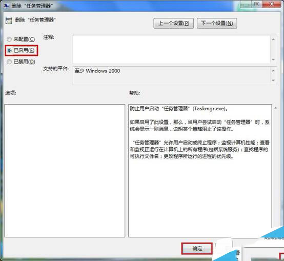 3、在彈出的屬性設置窗口中,我們只需點擊選擇“已啟用”單選框即可,然后按“確定”保存設置,如下圖所示: