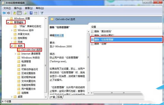 2、打開本地組策略編輯器窗口后,依次點擊展開“用戶配置/管理模板/系統/Ctrl+Alt+Del選項”,我們在右邊窗格中鼠標左鍵雙擊“刪除任務管理器”,如下圖所示: