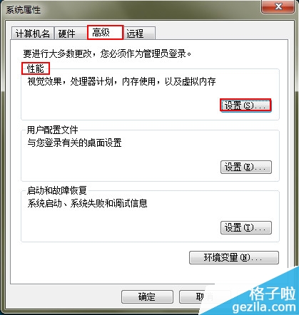 3、打開系統屬性后,切換到“高級”選項卡,然后點擊性能中的“設置”按鈕,如下圖所示: