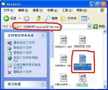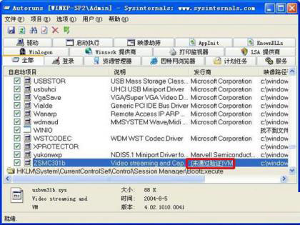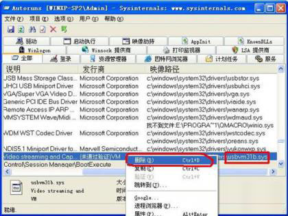 8、為了徹底不留后患,按照AUTORUNS提供的信息找到該映像文件(刪除ZSMC301B這個自啟動項前可以在其項目條上右鍵,選擇“復制”,將復制內容粘貼到寫字板或記事本中,以便刪除映像文件時查找該文件的路徑和文件名),刪除c:windowssystem32driversUSBVM31B.SYS這個文件。