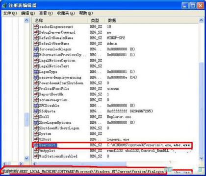 5、用注冊表編輯器修改[HKLMSOFTWAREMicrosoft Windows NTCurrentVersionWinlogonUserinit]這個值項的值,由被病毒修改后的“c:windowssystem32 userinit.exe ,ABC.EXE”改為正常的“c:windowssystem32userinit.exe,”(修改注冊表值項值的操作這里就不羅嗦了)
