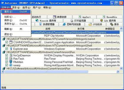 3、“文件”--“查找”--輸入“c:windowssystem32userinit.exe”--回車,讓AUTORUNS自動查找包括“c:windowssystem32userinit.exe”字段的自啟動值項并定位;