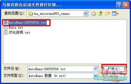 2、 “比較”:用于比較當前狀態和以前保存過的日志的差異并設置標記。如果選擇這個菜單項目,則彈出一個對話框要求你選擇一個你保存過的以前的日志,選定所需要的日志后,點“打開”,如果選定的日志的自啟動子項、自啟動值項與當前的狀態有差異,AUTORUNS將以綠色突出顯示,表示前后的自啟動項存在不符。超有用的功能(后面有介紹)。