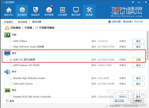 3、進入后,我們再點擊“備份還原”這一欄,如果驅動后面出現了“還原”,那就說明驅動已經備份過了,可以進行還原,我們只要點擊“還原”就可以恢復驅動了。