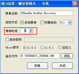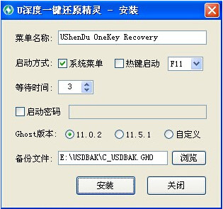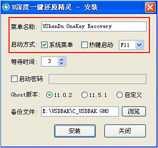 此時在屏幕中會彈出新的設置窗口,在此窗口中,我們可以看到有關u深度一鍵還原精靈啟動菜單模式有關的參數設置,如下圖所示: