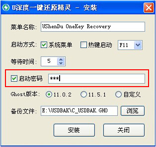 下方的啟動密碼選項,可防止非本人操作的情況下,隨意對自己電腦進行備份系統和還原系統的操作,用戶根據需要可勾選此選項,設置一個只有自己知道的啟動密碼,如下圖所示: