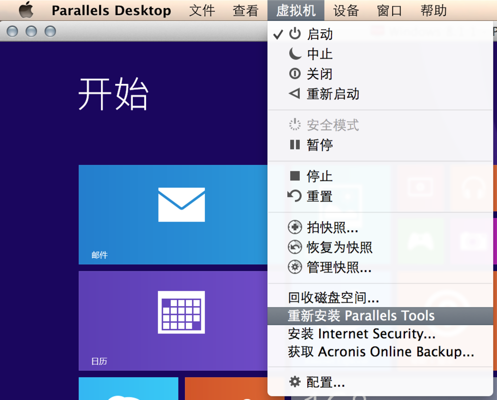 安裝完成后,如果屏幕分辨率顯示不正常,無法上網(wǎng)等,在菜單里手動安裝Parallels Tools