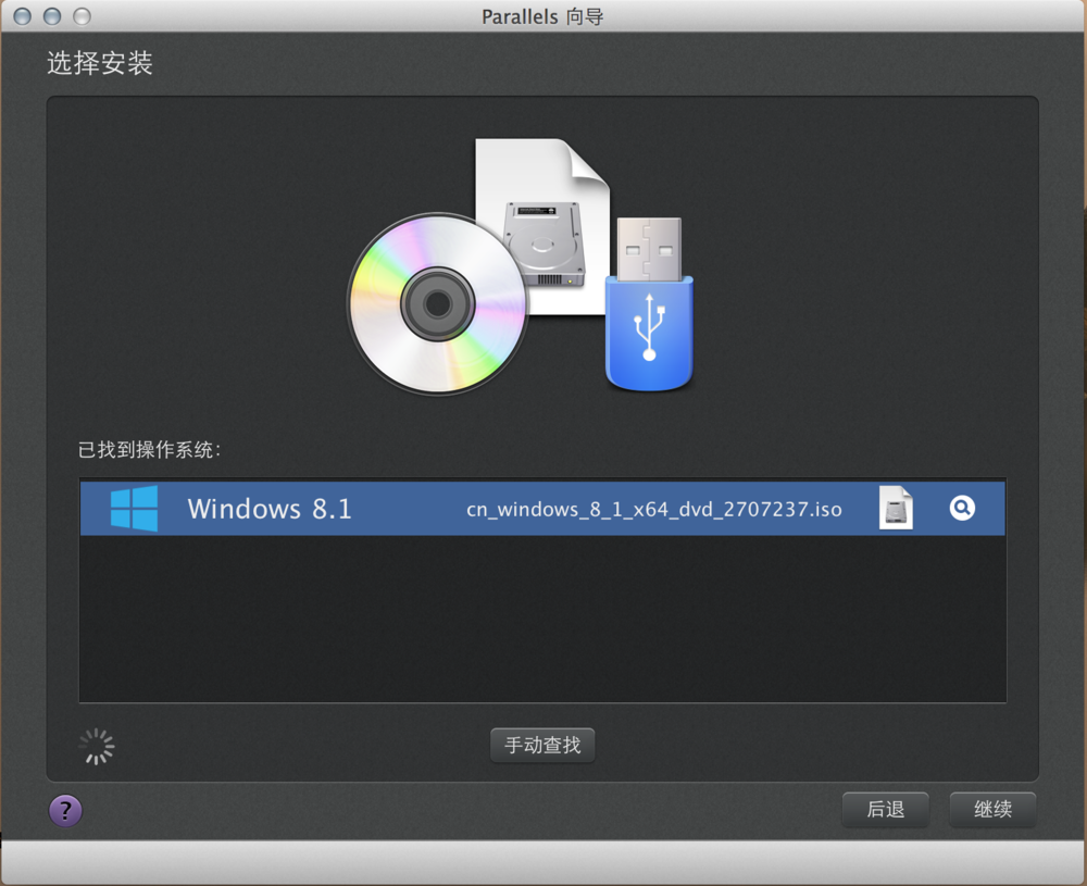 安裝完后出現(xiàn)Parallels向?qū)В@里我們選從DVD或者鏡像文件安裝。