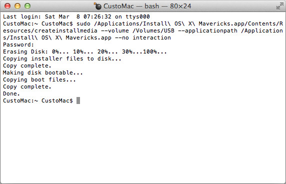sudo /Applications/Install/ OS/ X/ Mavericks.app/Contents/Resources/createinstallmedia --volume /Volumes/USB --applicationpath /Applications/Install/ OS/ X/ Mavericks.app --no interaction