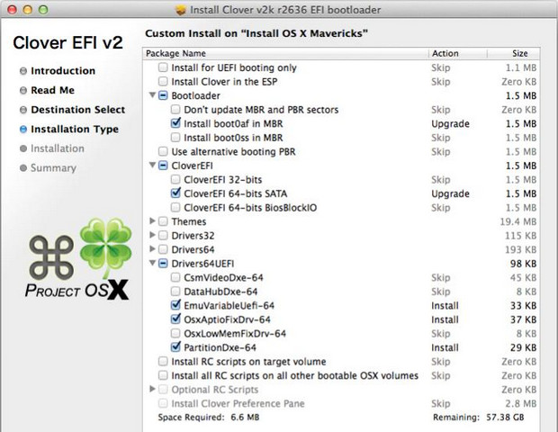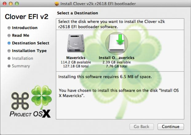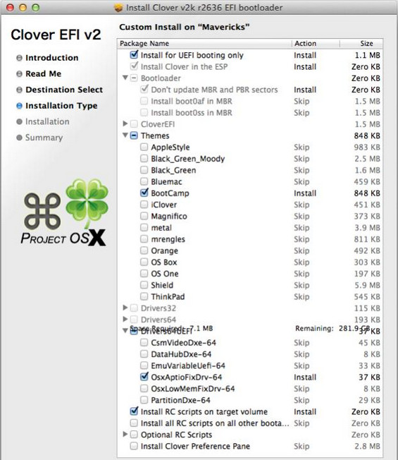 在這一點上,最簡單的方法是從您的USB驅動器的根目錄下安裝引導程序,抓取備份,和復制直接工作于系統硬盤的EFI分區中的文件。不管怎樣,讓安裝后的系統100%適合你,必須按個別情況下完成。沒有一個單一的四葉草設置會很好地工作在每一個系統。為了獲得最佳的兼容性,建議EFI分區也被重新格式化為FAT32,而不是默認的HFS。