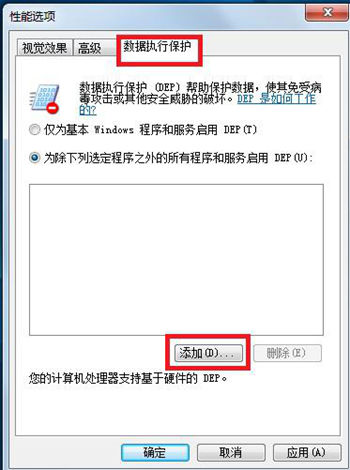 2. 在“性能選項”界面中選擇“數據執行保護”,然后選擇“為除下列選定程序之外的所有程序和服務啟用DEP(U)”,之后點擊“添加"按鈕;