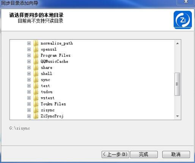 選擇與建立同步關系的本地目錄,在該教程中,我們選擇“G:/zisync” ,點擊【完成】后,這樣我們就完成了在兩個設備目錄之間建立同步關系的操作。