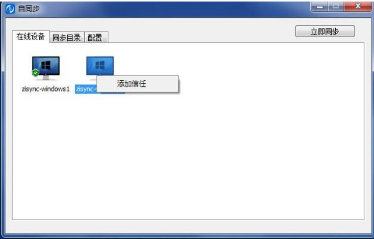 Step 2:建立設備間的互相信任, 鼠標右鍵點擊設備 zisync-window2,點擊【添加信任】,向 zisync-window2 發送請求信任的請求,如圖,