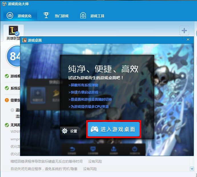想在暴風(fēng)雨里來臨之前,痛痛快快的和隊友玩一場?快打開游戲優(yōu)化大師,點擊右邊高級工具——游戲桌面。