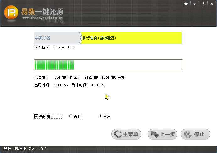 易數(shù)一鍵還原的備份速度是非??斓?,通常都能夠達(dá)到1G/每分鐘以上,備份一個Windows 7系統(tǒng),只需要幾分鐘!如果您沒有修改備份時默認(rèn)的備份完成后的操作選項,易數(shù)一鍵還原備份完系統(tǒng)后,又會自動重新啟動到Windows。