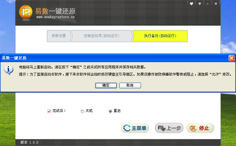 軟件還會提示您,因為涉及了磁盤底層,接下來的操作有可能會被防病毒軟件警告或阻止,如下圖所示,您放心,易數(shù)一鍵還原是絕對安全的,沒有任何惡意的操作!