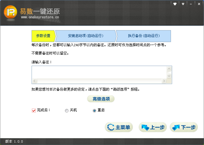 易數(shù)一鍵還原支持增量備份與多時間點還原,您可以為本次備份添加備注,以供還原時參考,此外,你還可以設(shè)置備份操作結(jié)束后,是關(guān)閉電腦還是重新啟動到Windows。