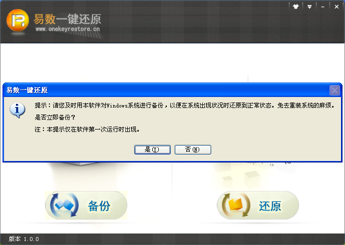 此外,第一次運行易數(shù)一鍵還原軟件時,軟件會提示您備份系統(tǒng),如果您選擇“是”,軟件也會開始備份系統(tǒng)的操作,如下圖所示: